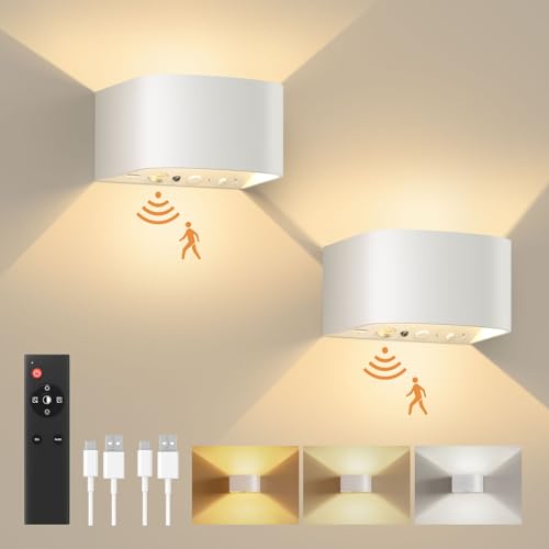 FULEN Wall Lights with Motion Sensor, Remote Control, 3 Colors,Up and Down Indoor LED Wall Sconces,On and Auto Modes,5000mAh Rechargeable Battery Operated Wall Lamps for Bedroom,Living Room,Stairs