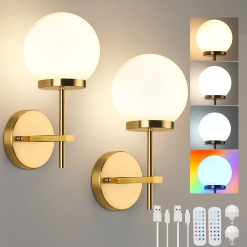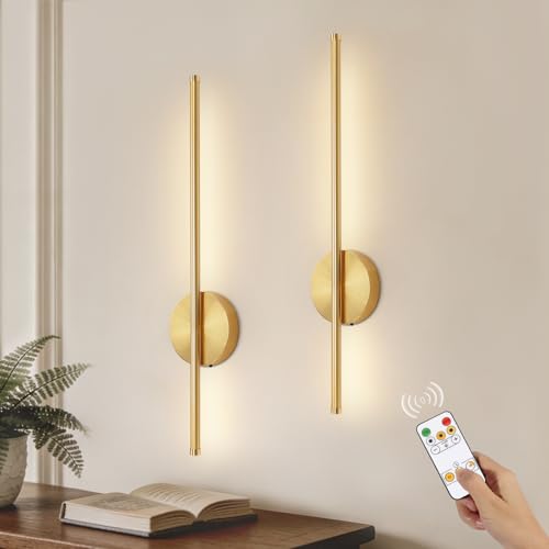 Battery Operated Wall Sconces Set of 2, Rechargeable Wall Lights with 4 Brightness and 3 Color Temperature Dimmable, Wall Lights with Remote and led Light Bulb for Bedroom Living Room Hallway(Gold)
