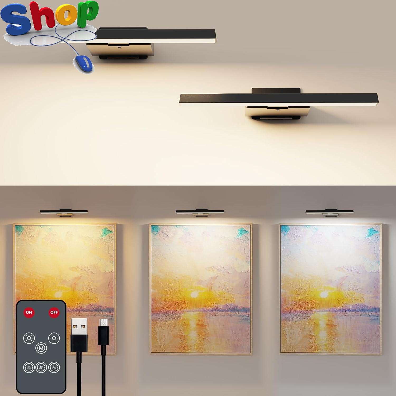 2 Pack Picture Lights for Wall, Cordless Rechargeable Wall Lights, Battery Opera