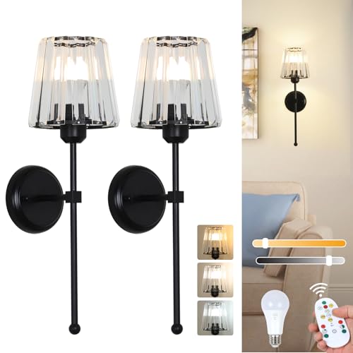 Stepeak Battery Operated Wall Lights Set of 2, Wireless Wall Lights Battery Operated with Rechargeable Bulbs, Black Crystal Rechargeable Wall Light Indoor, Glass Stick On Wall Sconces for Bedroom Hall