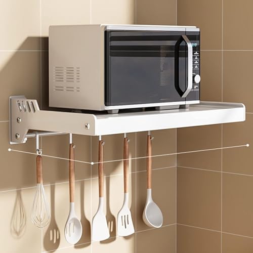MEHOOSPVN Wall Mount Microwave Oven Shelf Rack Microwave Oven Shelf Carbon Steel Wall Shelf Metal Shelving Heavy Duty Commercial Or Household Grade Wall Mount, with 6 Hooks for Kitchen Home