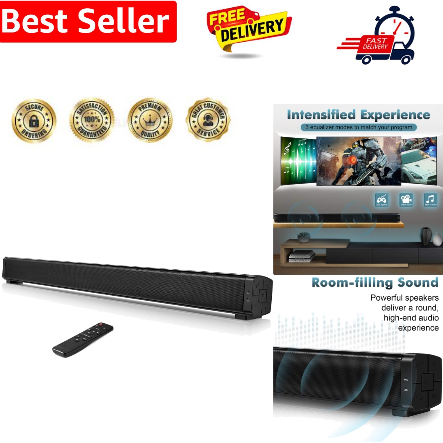 Aisung Soundbar for TV, 32-inch Home Theater Stereo Sound Bar Wall Mountable TV Speakers with Subwoofer, Wireless Bluetooth 5.0, HDMI/Optical/Coaxial