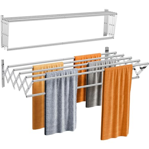 Wall Mounted Clothes Airer Foldable Towel Rail Retractable Clothes Drying Rack With 6 Poles, Stainless Steel Airer Clothes Dryer Bathroom Towel Holder Space Saving Rust Resistant Indoor or Outdoor