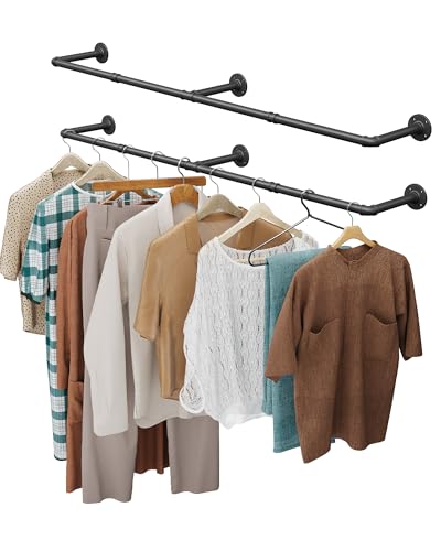 FANHAO Industrial Pipe Clothes Rail, Heavy Duty Rustic Detachable Wall Mounted Clothes Rack Black Iron Garment Bar, Multi-purpose Hanging Rod for Closet Storage, 2 Pack