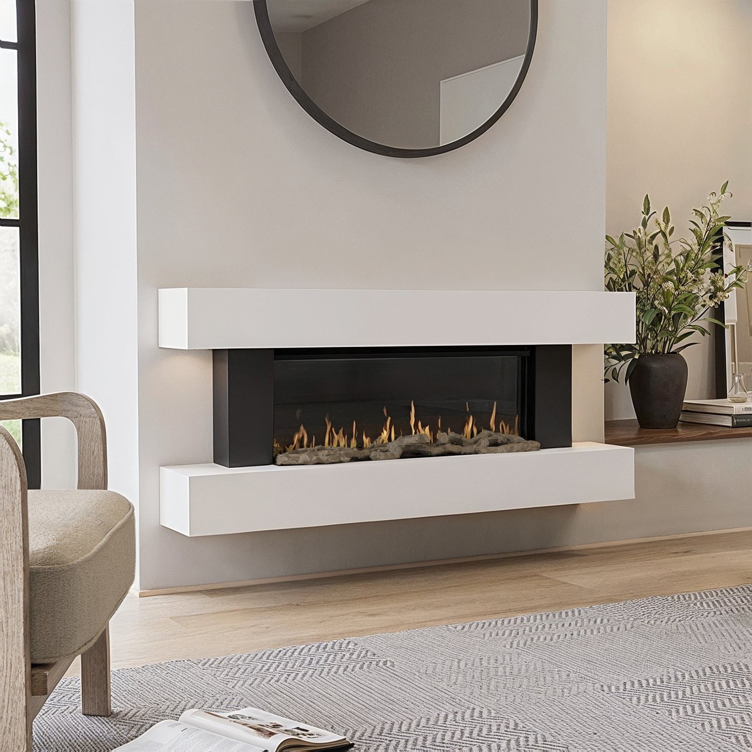2025 TRUFLAME WHITE FLAT GLASS LED WALL MOUNTED ELECTRIC FIRE - PEBBLES AND LOGS!