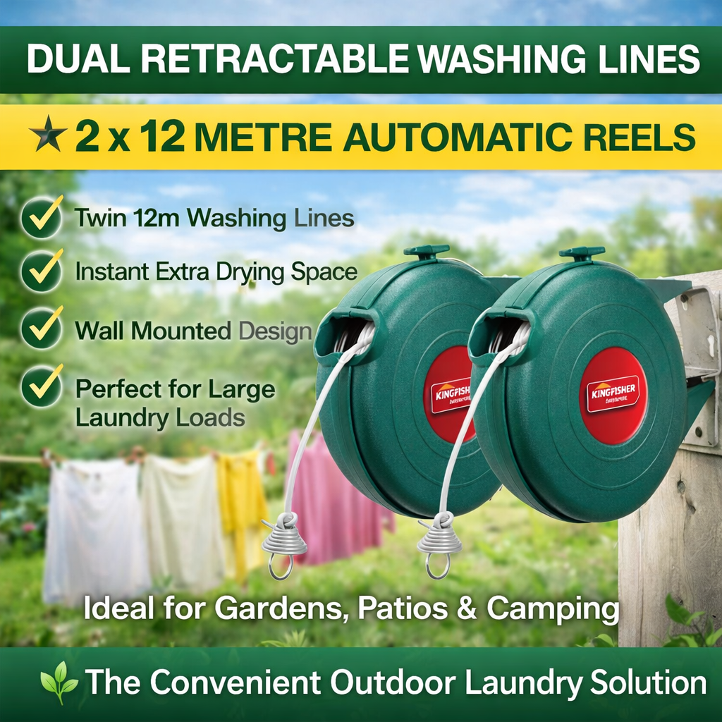12m Retractable Clothes Reel Double Washing Line Wall Mounted Outdoor Indoor