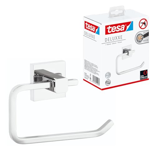 tesa DELUXXE Toilet Roll Holder without Lid - Wall-Mounted Toilet Paper Holder with Power.Kit Technology in Stainless-Steel Design - waterproof, incl. Adhesive Solution - 99mm x 160mm x 45mm