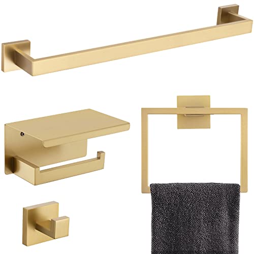 Brushed Gold Bathroom Towel Bar Holder Sets Premium Stainless Steel 4-Piece Bathroom Hardware Set Wall Mounted Bathroom Toilet Paper Holder with Shelf Set.