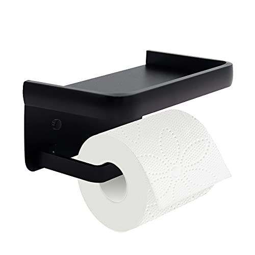 Self Adhesive Toilet Paper Holder with Phone Shelf, Wall Mounted Toilet Paper Roll Holder, Rustproof Bathroom Washroom Tissue Roll Holder with Shelf, Toilet Paper Roll Dispenser- Matte Black