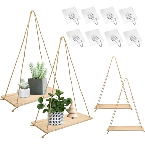 YKUKIZEE 4 Set Wooden Hanging Shelves with Rope, Floating Hanging Shelf with String, No Drilling Rope Hanging Floating Shelves for Wall Decoration Display Plant Photo(Single Layer)