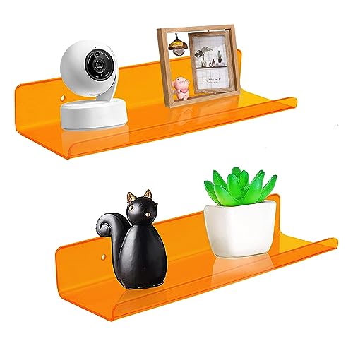 ROYALITA Small Acrylic Shelves Wall Mounted | Set of 2 | 12 Inches | Wall Hanging Plant Display Shelves, Room Decor Floating Wall Shelves for Gaming Room Bedroom, Living Room, Office, Orange