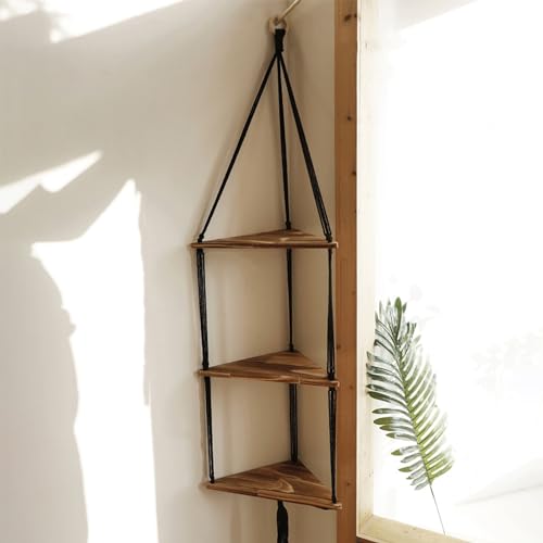 DDWRGD White Wall Shelf Hanging Shelf Wooden Floating Shelves Boho Wood Corner Shelf Wall Mount Plant Holder for Wall Decoration (Black Third Layer)
