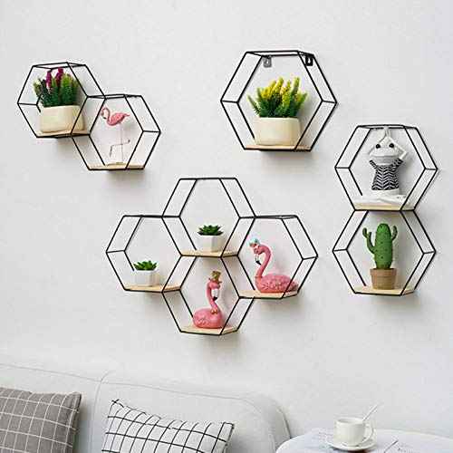 Hexagonal Floating Shelves Wall Mounted Shelf, Rustic Shelves, Metal Wall Shelves for Bedroom,Bathroom,Living Room,Kitchen,Home Office, Wall Plant Holder Flower Pot Planter Stand Home Decor Black M