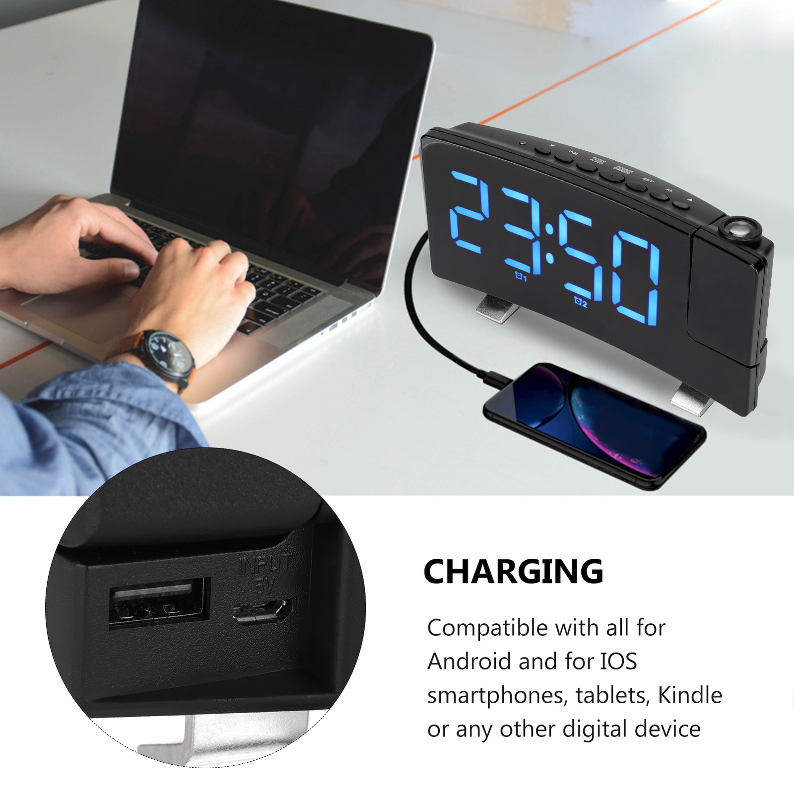 Digital Alarm Clock 180° Projection On Ceiling And Wall USB Powered Alarm Clock