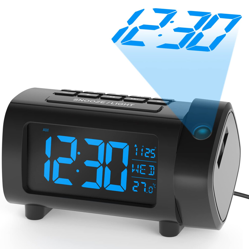 Projection Alarm Clock for Bedroom,LED Digital Clock Projection on Ceiling Wall with USB Phone Charging,Battery Backup,180Projector&Dimmer,12/24H,D