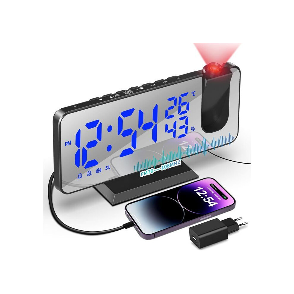 Digital Alarm Clock 180 Projection On Ceiling Wall USB Powered Alarm Clock for Bedroom Heavy Sleeper Kid Elderly Blue Font