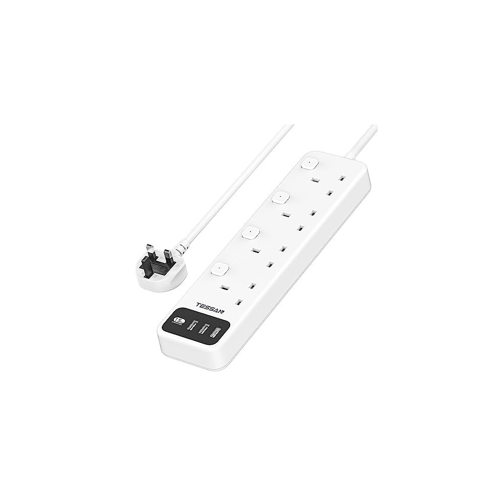 Extension Lead with 3 USB Slots, TESSAN 4 Way Multi Plug Extender with Individual Switches, Wall Mount Socket Extension Cable 2M, 3250W Multiplug