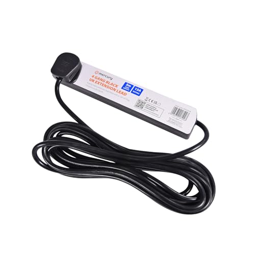 Mercury 4 Gang Extension Lead 5.0m Black 4 Plug UK Socket with 13A Mains Lead, Wall‑Mountable, Extended Reach & Compact Low‑Profile Power Block for Home, Office, Bedroom or Kitchen