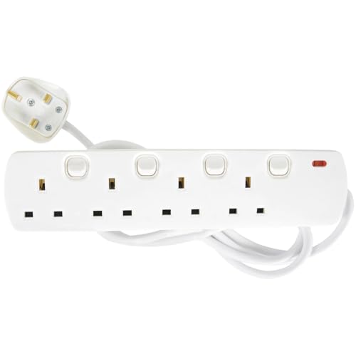 Mercury | 4-Gang Individually Switched Extension Lead | 2m Cable | UK Plug | White | Multi-Socket Individually Switched Power Strip with Wall Mount & Neon Indicator