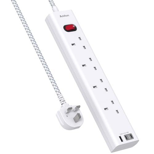 Extension Lead with 3 USB Slots(2 USB C), 4 Way Plug Extension Socket, 1.8M Wall Mount Socket Extension Cable, Multiplug Power Strip for Home, Office,