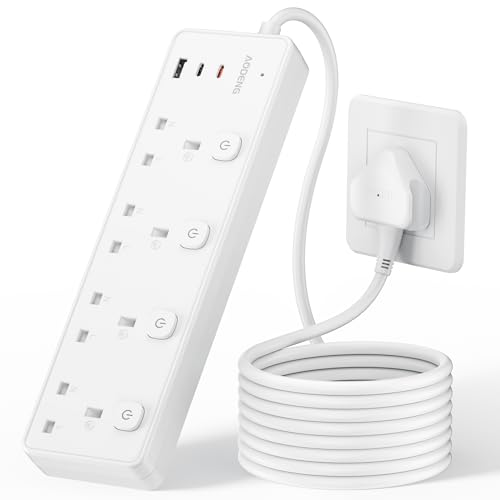 Extension Lead with 3 USB Slots(30W),4 Way Sockets Outlets Ports Extension Cable with 4 Individual Switches Surge Protected,Wall Mountable Extension Socket for Home,Office,School,5M,White