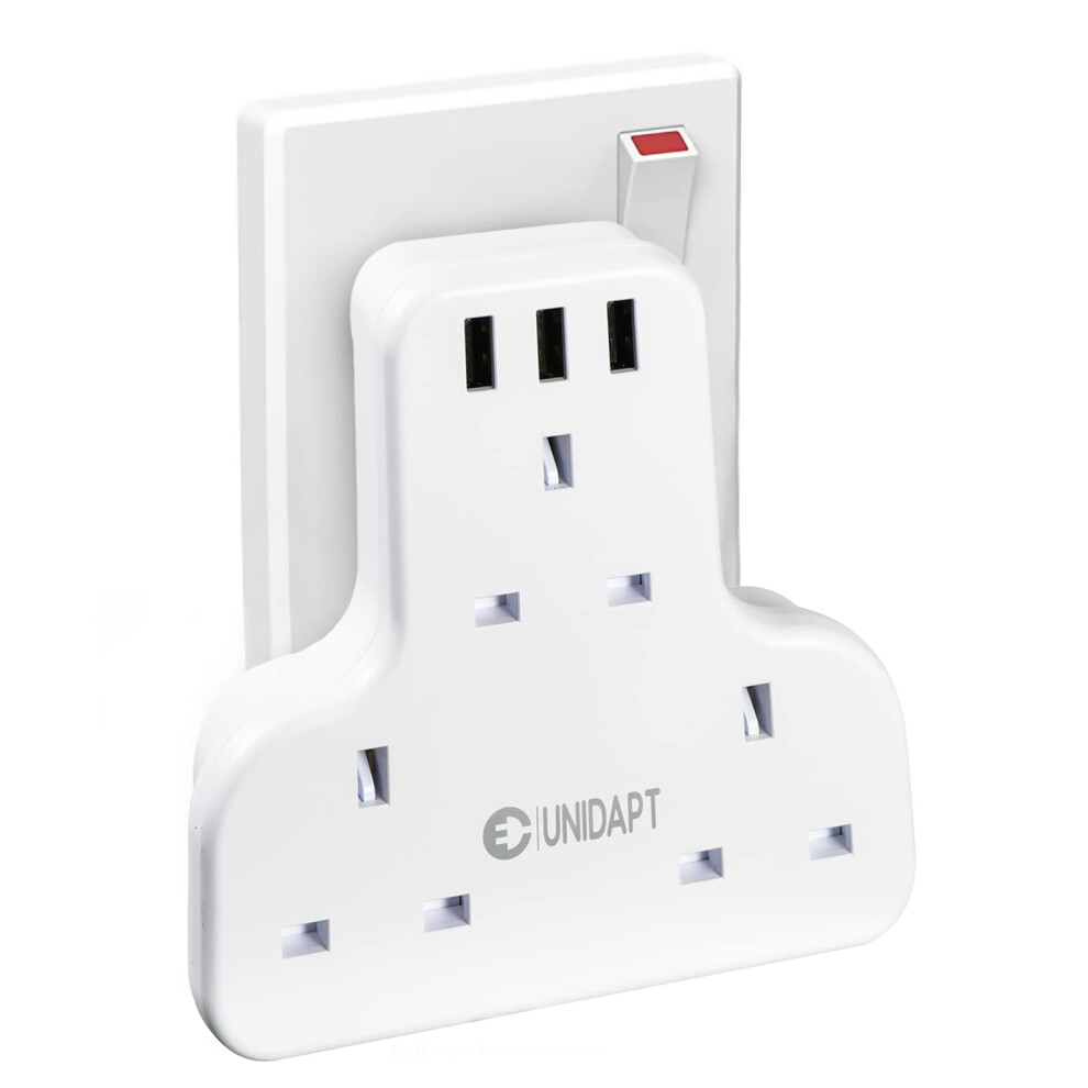 Unidapt 3 Way Plug Adapter with 3 USB Ports, 13A Multi Plug Extender 6-in-1, Flat Wall Socket Extension, UK 3 Pin Type G Plug for Home, Office, Kitch