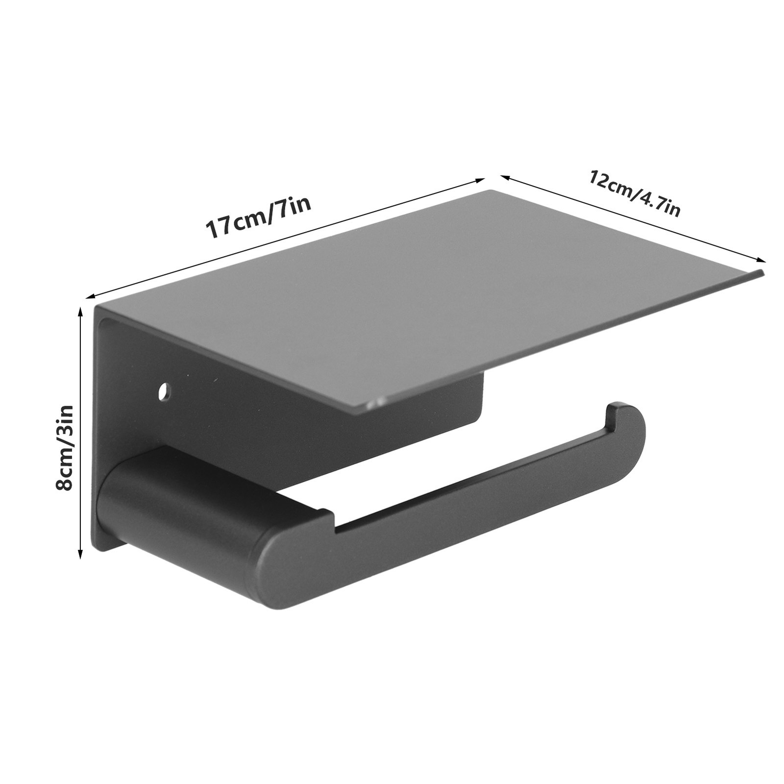Self Adhesive Toilet Paper Holder with Phone Shelf, Wall Mounted Toilet Paper Roll Holder, Rustproof Bathroom Washroom Tissue Roll Holder with Shelf, Toilet Paper Roll Dispenser- Matte Black