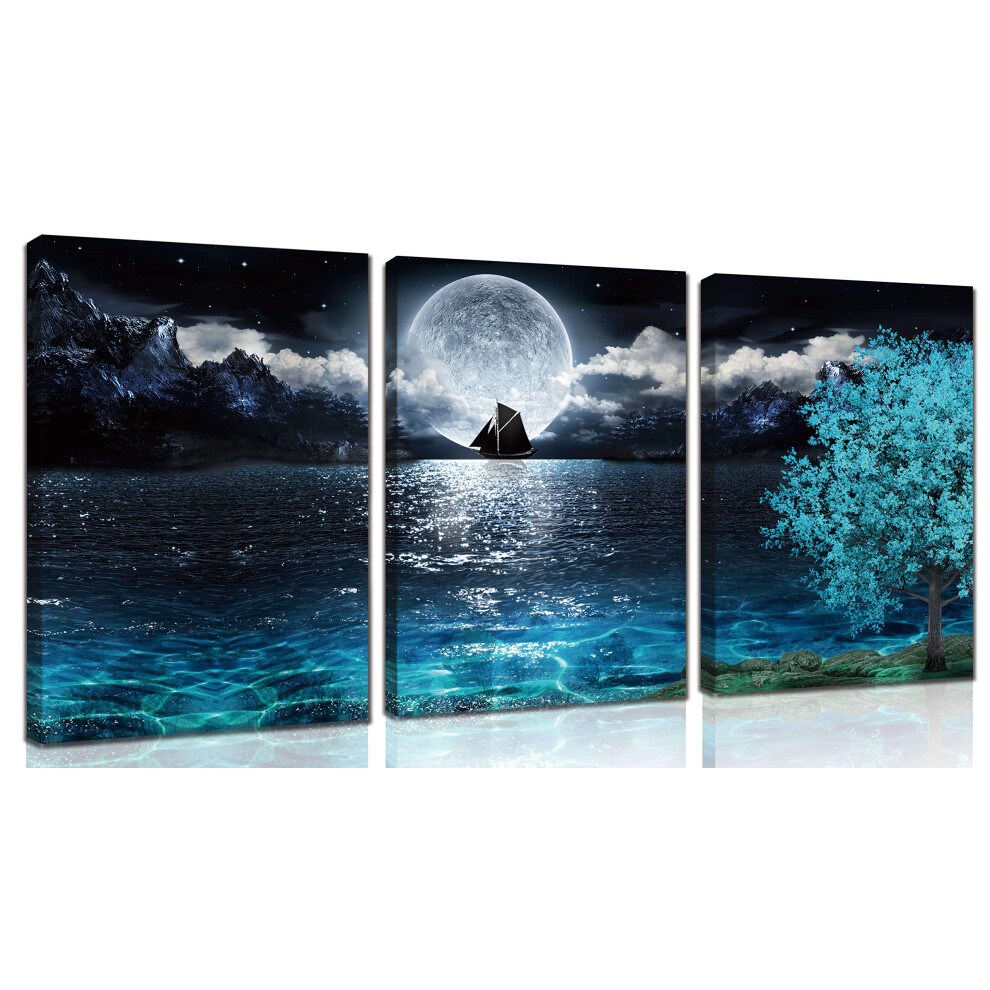 Moon Wall-Art For Bedroom - Teal Wall Art For Living Room - Ocean Tree Home Wall Decor 3 Pieces Framed Canvas Art 16x24 Inches