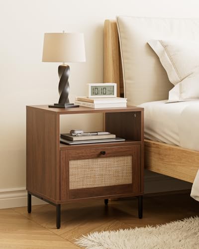 Apetaccat Rattan Bedside Table, Wooden Bedside Table, Walnut Boho Bedside Cabinet with Drawer and Open Shelf, 47 x 39 x 54 cm, for Bedroom, Living Room