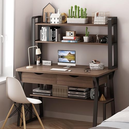 Modern Computer Desk With Hutch And Bookshelf - Stylish Home Office Workstation - Study/Writing Table With Upper Storage Shelves,Walnut,100cm