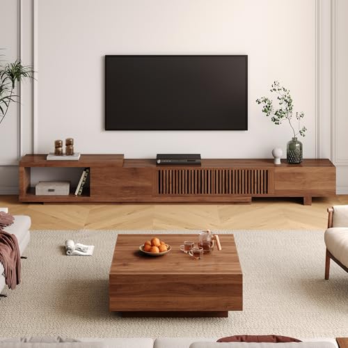 GildedGrove Vintage Extending TV Unit 200-260cm - Walnut TV Stand with 4 Storage Options (2 Drawers + 2 Cabinets), Space Saving for Large Screens, Ideal for Flats & Small Spaces(without coffee table)