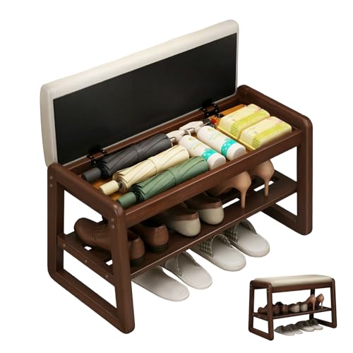 BaoBaJiu Solid Wood Shoe Bench, Hallway Bench with Storage Space with PU Leather Seat Cushion, Shoe Rack Bench, 2 Levels Shoe Cabinet, Narrow for Entrance Area & Wardrobe (Walnut + Black Pad, 55 cm)