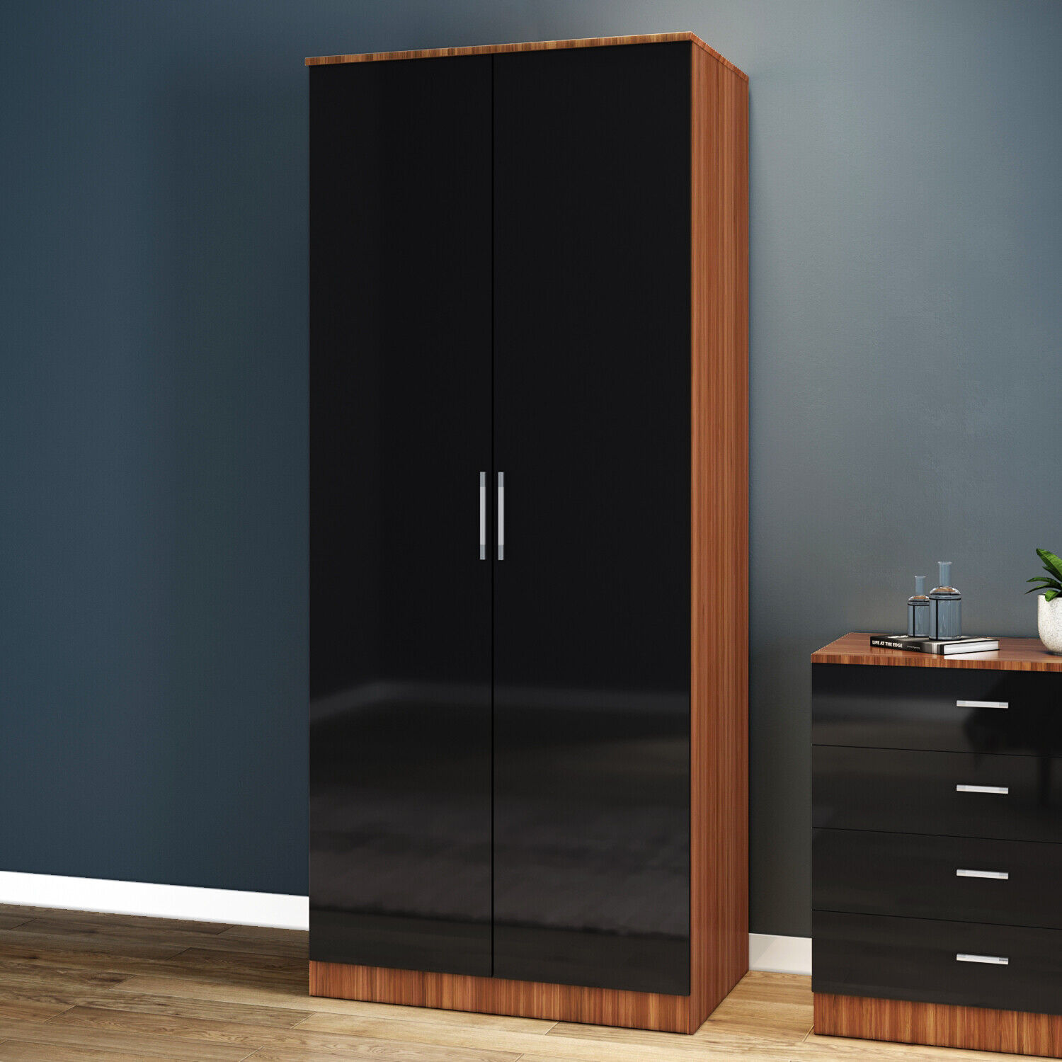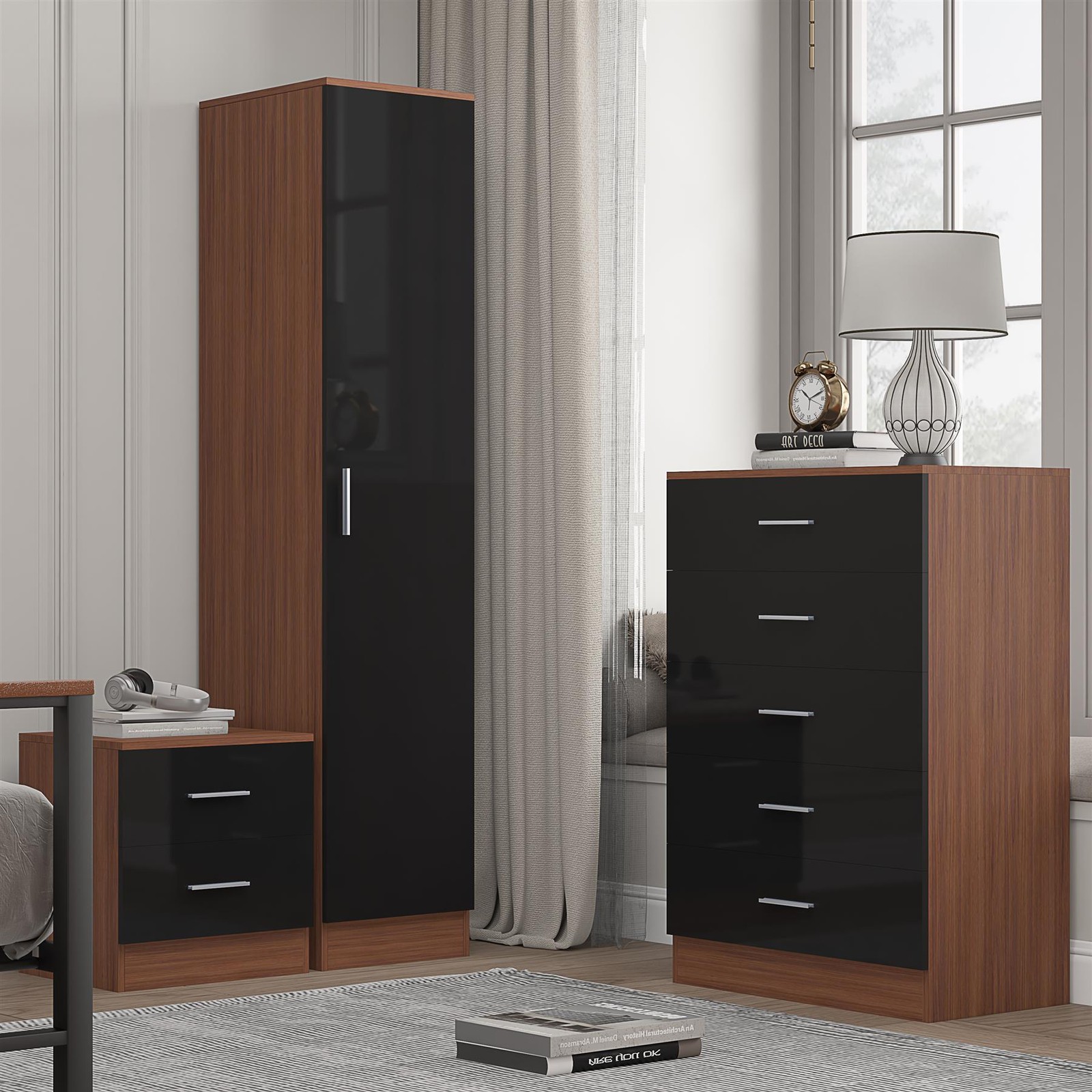 REFLECT 3pc High Gloss Bedroom Set - Black/Walnut Wardrobe + Chest + Bedside
