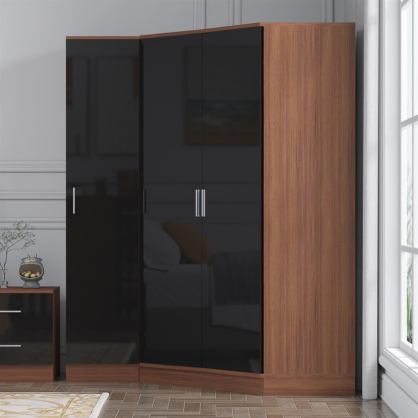 REFLECT Black Gloss 2 Door Corner + 1 Door Wardrobe - Walnut Matt Carcass