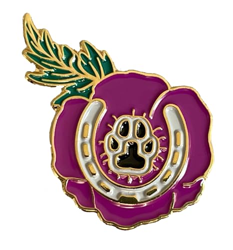 Purple poppy lapel pin badge Dogs paw horseshoe, remembering animals in war Lest we forget