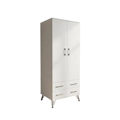 FWStyle Maldon 2 Door Double Wardrobe with 2 Drawers Matt White Bedroom Furniture with Hanging Rail & Metal Legs H186 x W76.5 x D55cm