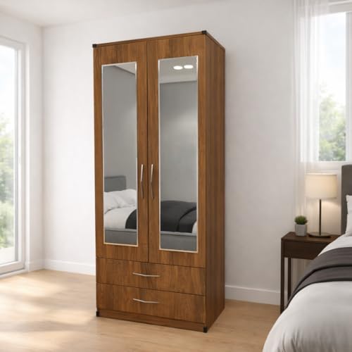 2-Door Mirrored Wardrobe with Drawers, White, 184x78x50 cm, Silver Handles, Ready to Use, No Assembly Required (Walnut)