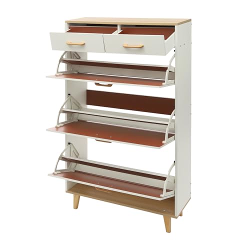 WooDerson Shoe Wardrobe With Drawers White High, Modern Small Wardrobe For Entrance Area, Shoe Rack White High Gloss With Wooden Board And Open Tray