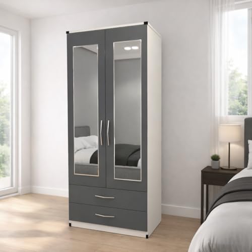 2-Door Mirrored Wardrobe with Drawers, White, 184x78x50 cm, Silver Handles, Ready to Use, No Assembly Required (Grey & White)