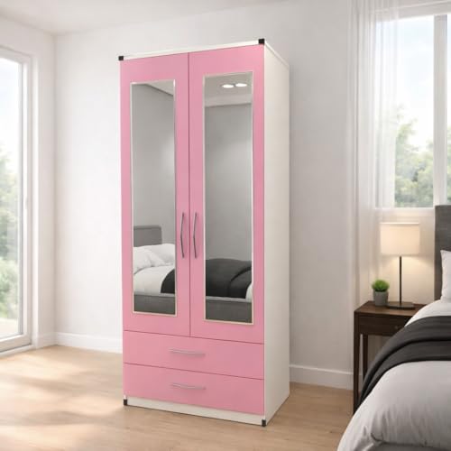 URBNLIVING Modern Kids Large Bedroom Double Wardrobe 2 Doors and 2 Drawers Closet Cupboard Storage Unit (Pink Carcass + White Drawers)