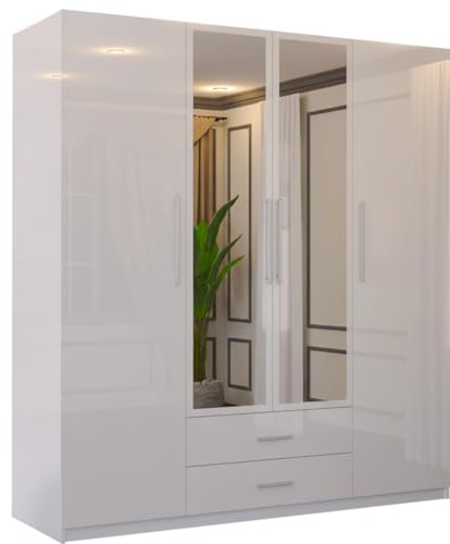 SLIDING WARDROBE 4U Modern Hinged Wardrobe 4 Door with Mirror Panels and Drawers, Large Storage Design, 200cm (White)