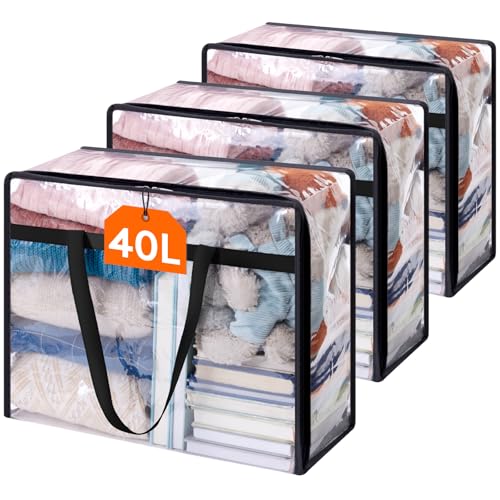 Lifewit 3 Pack Clear Plastic Storage Bags, 40L Foldable Clothes Storage Boxes Wardrobe Storage Organizer Moving Bags with Reinforced Handle for Loft Wardrobe for Bedding Clothes Blanket Duvet
