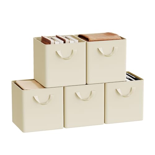 WOLTU Storage Boxes Set of 5, Storage Baskets, Folding Wardrobe Cube Boxes, with Handle and Metal Frame, for Living Room/Bedroom/Study, Linen, 26x26x26.5cm, Cream