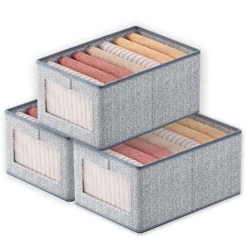 Alyvisun 3 Pack Wardrobe Storage Boxes with Clear Window, Foldable Fabric Storage Boxes, Cotton-Linen Wardrobe Organiser with Handles for Baby Clothes, Toys, Jeans, Scarf, T Shirt (45 x 34.5 x 18 cm)