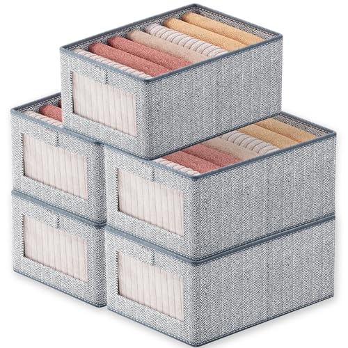 Goesort Set of 5 Clothes Storage Boxes, Wardrobe Storage Organiser Fabric Clothes Organiser, Storage Boxes with Clear Window For Jeans Pants Shirts Leggings Sweaters, Medium