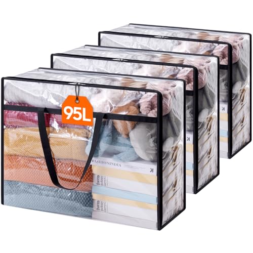 Lifewit 3 Pack Clear Plastic Storage Bags, 95L Foldable Clothes Storage Boxes Wardrobe Storage Organizer Moving Bags with Reinforced Handle for Loft Wardrobe for Bedding Clothes Blanket Duvet