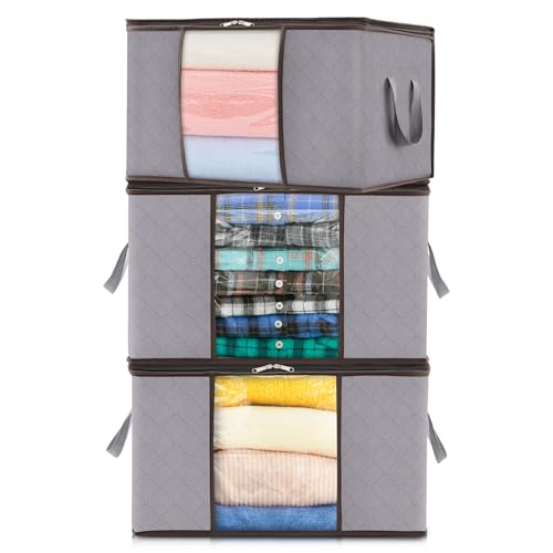 Lifewit 50L Clothes Storage Boxes, Storage Bags Moving Boxes Wardrobe Storage Organiser with Reinforced Handle Sturdy Fabric Clear Window for Clothing Bedding Sweater T-Shirt, 3 Pack, Light Grey