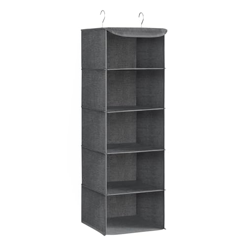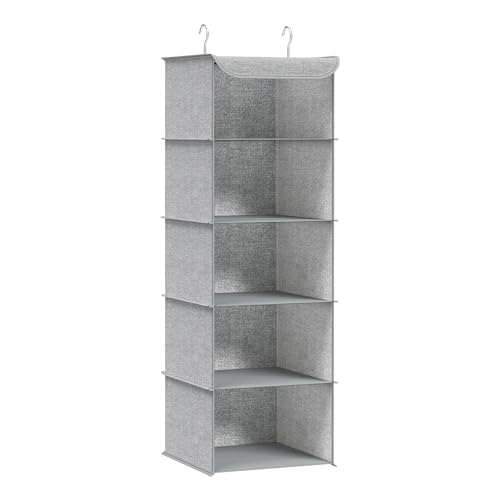 LuLobtg Hanging Wardrobe Storage Organiser, Multi Tiers Hanging Storage Shelves with Metal Hooks, Space-Saving, Bamboo Inserts, Foldable Clothes Organizer Rack for Closet, RV(5 shelf)