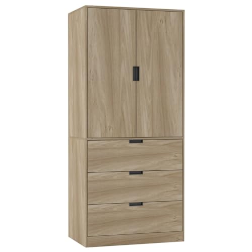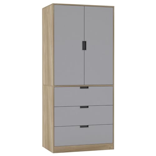 URBNLIVING Modern 2 Door Wardrobe with 3 Drawers & Hanging Rail, Stylish Freestanding Storage, Spacious Interior, Durable Chipboard Build, Easy to Assemble Bedroom Furniture