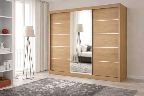 IE INTERIOR EMPORIUM Lyon Sliding Door Wardrobe – Multiple Sizes (120cm, 150cm, 180cm, 203cm, 250cm) with Mirror Sliding Doors and Ample Storage (Oak, 250cm)